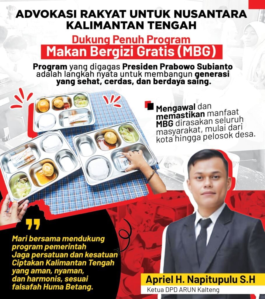 Palangka Raya – Ketua DPD Aliansi Relawan untuk Nusantara (ARUN) Kalimantan Tengah, Apriel Napitupulu, menegaskan komitmennya dalam mendukung Program Makan Bergizi Gratis (MBG) yang menjadi salah satu prioritas Presiden Prabowo Subianto. Menurutnya, program tersebut merupakan langkah konkret pemerintah dalam membangun generasi masa depan yang lebih sehat dan berkualitas.