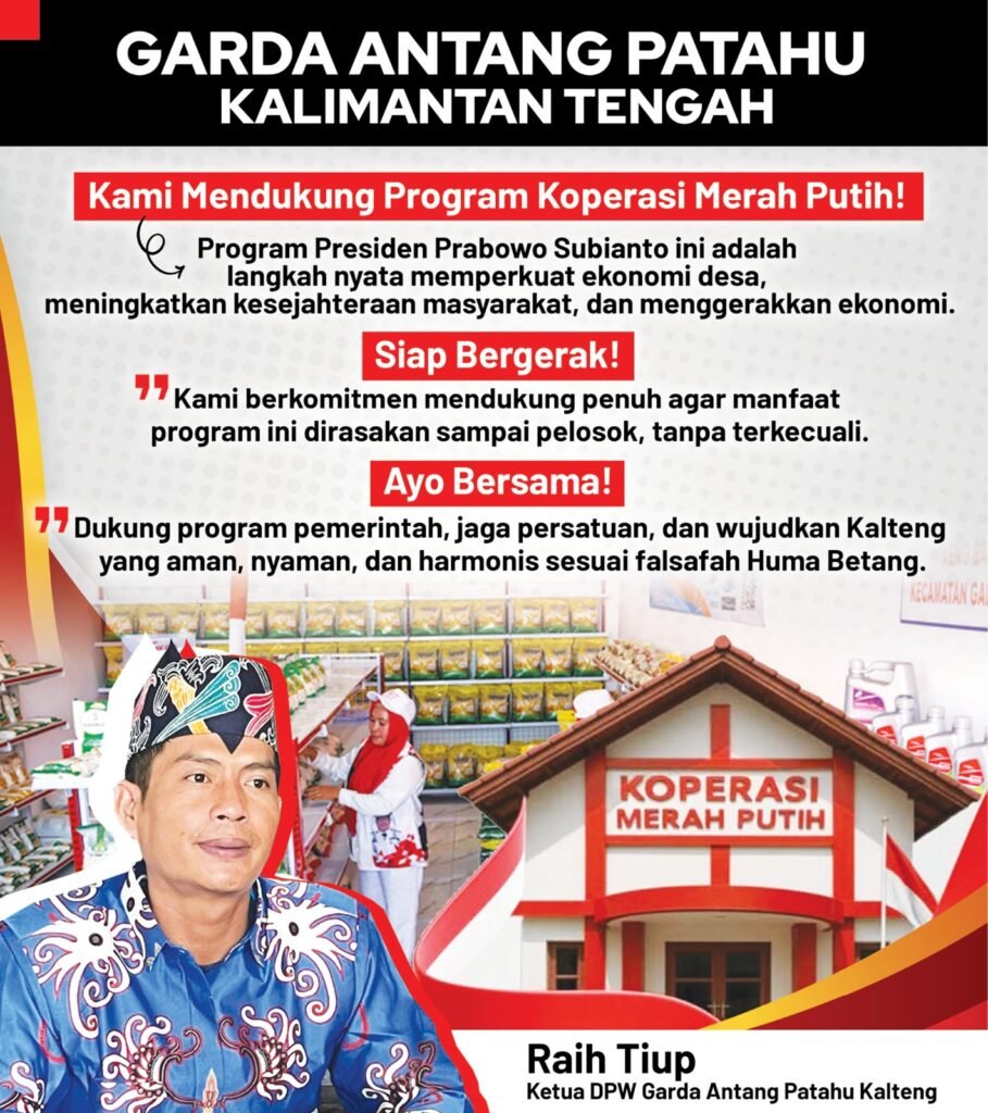 Palangka Raya – Ketua DPW Garda Antang Patahu Kalimantan Tengah, Raih, menegaskan komitmen organisasinya dalam mendukung Program Koperasi Merah Putih yang digagas Presiden Prabowo Subianto. Ia menyebut program tersebut sebagai instrumen penting dalam memperkuat struktur ekonomi masyarakat di tingkat desa.